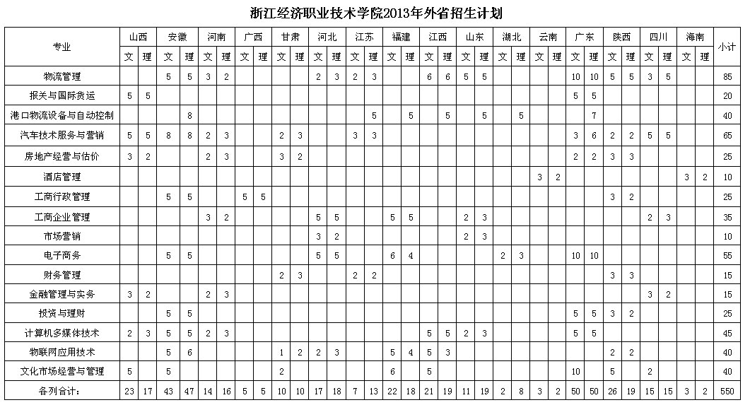 浙江经济职业技术学院2013年外省招生计划