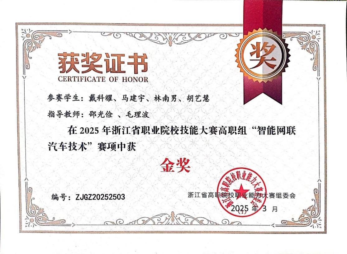 指导学生获2025年浙江省智能网联汽车技术竞赛金奖
